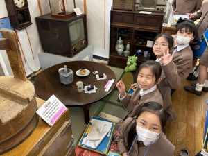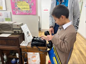 洗濯板を使っての洗濯では、手を真っ赤にしながら「冷たいよ。お湯入れて。」「シーツとか洗うのは大変だよ。」と話している子。黒電話の数字を一生懸命押している子など。社会の時間に昔のくらしについての学習をしましたが、実際に目にして、触って、体験することでより昔の人たちの大変さや日常の工夫の素晴らしさを実感できたようです。